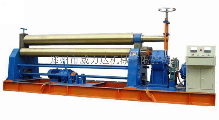 該機為對稱式三輥卷板機,兩下輥為主動固定輥,上輥通過升降絲桿、渦輪、蝸桿在兩下輥對稱中央作上下移動,兩下輥的左、右旋轉(zhuǎn)和上輥的升降移動均靠電機帶動減速器來完成,并能借助手動離合器把上輥調(diào)節(jié)成平行或傾斜位置,以適應卷制圓形和錐形工件的需要,渦輪上下配有特種壓力軸承,轉(zhuǎn)動輕松、省電耐磨。該機集機身、傳動、電器部分為一整體,其結(jié)構(gòu)緊湊、操作方便、便于搬運、安裝和維護。